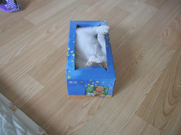 크리넥스 티슈 다쓰고 남은 빈통에 자꾸 발을 집어 넣길래 가위로 입구를 넓혀 줬더니 아주 좋아서 난리네요.